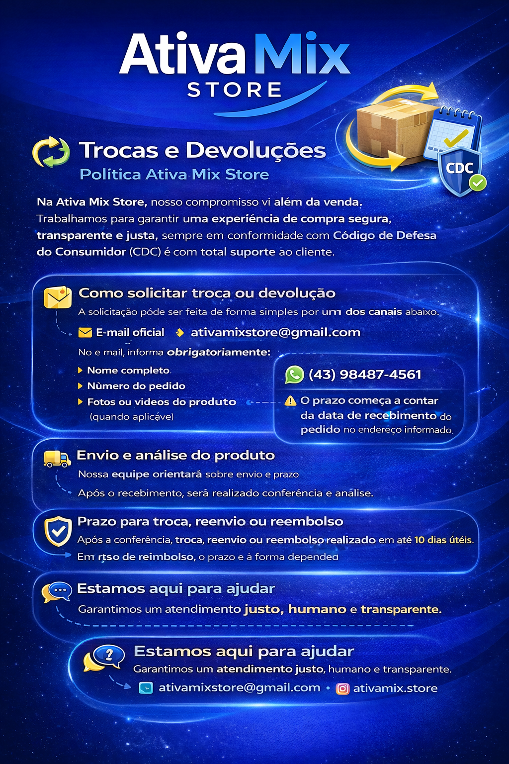 Início > Trocas e Devoluções – Política ATIVA MIX STORE