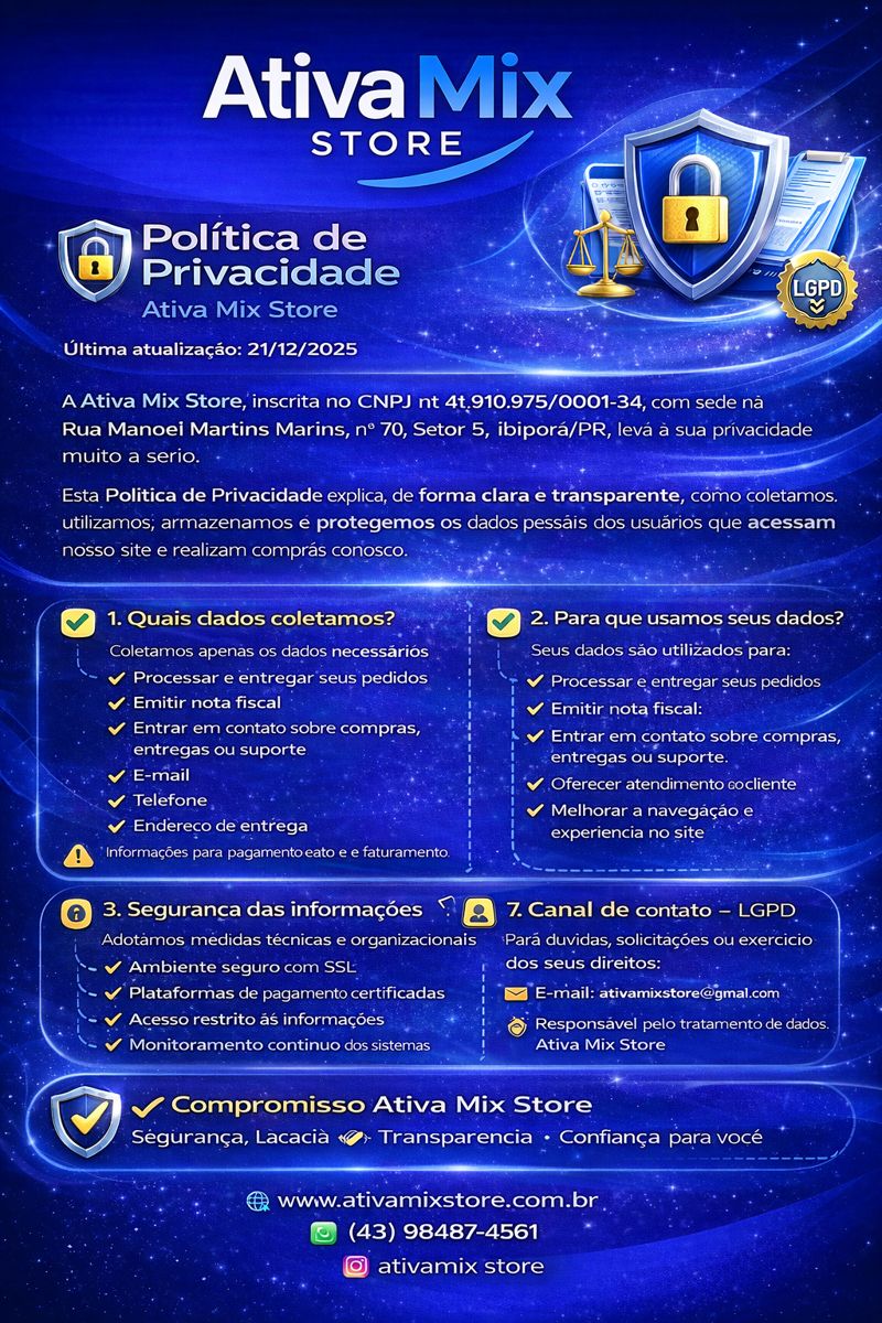 A Ativa Mix Store oferece produtos de qualidade, atendimento confiável e uma experiência de compra segura. Trabalhamos com tecnologia, importados e itens selecionados, sempre com procedência, nota fiscal, garantia e envio rápido para todo o Brasil.